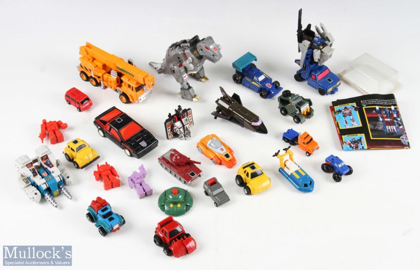 1980s Transformers Toys with noted items of Autobot minus hub cap, Warpath, Cosmos Wheelie, Seaspray, Dinobot Grimlock, battle charger Runaround, plus mor (#20)