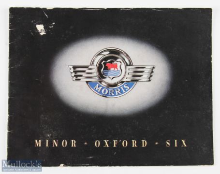 Morris Minor, Oxford, Six. 1950s Catalogue - 24 page catalogue with 12 colour illustrations, plus some photographs, also details and technical specifications, advertising the Morris Minor for £299 plus Tax. Printed on quality semi-gloss paper card cover size 11" x 8 1/2". Manufactured at Cowley, Oxford