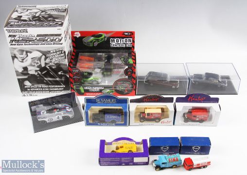 Toy Car and Motorbike selection to include a Taiyo: Honda NSR500 road racer motorcycle no.55* 1:10 Scale R/C Model, Fly c63 Porsche 908/3 Martini No 4 1000 km Nürburgring 1971 Slot car, 2 Oxford diecasts, red 5 motion control car, Fina cameo Corgi tankers collection cars, 4 collector advertising Lledo style vans Hamleys, H Samuel, Jersey Lavender