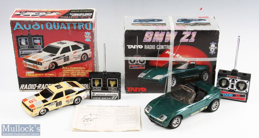 Taiyo Audi Quattro Radio Racer Battery Operated Car white plastic has turned tan colour over time, missing rear spoiler, with instruction leaflet and controller, in original fair box, with another Taiyo BMW Z1 radio-controlled car, in green, front splitter / bumper snapped off and missing, in original box, some tape marks to box (2)