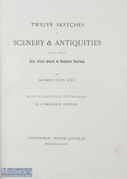 Twelve Sketches of Antiquities on The Line of The Great North of Scotland Railway by George Reid RSA Edinburgh 1883, published by David Douglas. First edition - large 115 page book, illustrated with 12 tissue guarded etched plates, illustrative letterpress by W Ferguson of Kinmundy. In cloth board cover 8 1/4" x 11"