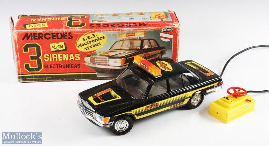 Rico, Spain Large Scale Mercedes Police Remote Controlled Car with 1, 2, 3 electronic sirens with black body and yellow controller, car appears overall good with fair condition box with split edges