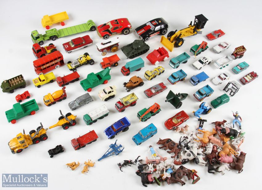 Diecast Toy Car Models a play worn selection of cars, to include Lesney. Matchbox, Tonka, Britains, plus a collection of plastic farm animals made in Hong Kong (box)