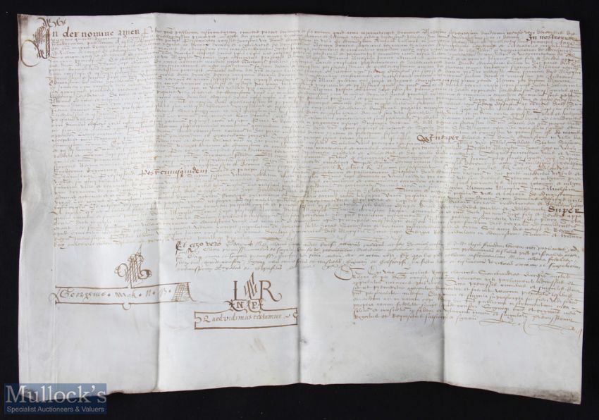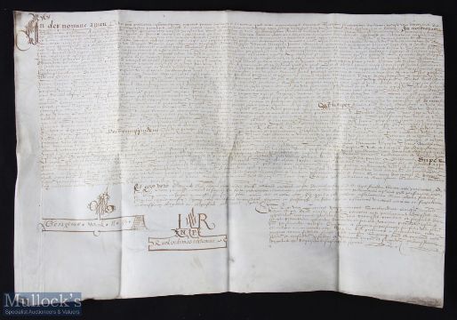 Scotland - Edmonston & Cauldcoates 1612: A fine charger relating to towns and lands in the district granted to Thomas Hope and his son John. 44 lines in Latin 20" x 13", on vellum with signs of two notaries below. The charter states that the lands belonged to the Queen Anne of Denmark, wife of King James I & VI, which she was given as her dower in 1589. The hope family became Earls of Hopetoun and still live in the district