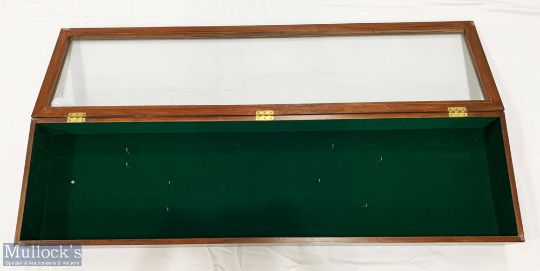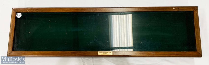 Dark Wood Lidded Display Case with glass hinged lid used for displaying golf clubs - size #13cm x 35cm x 133cm. NB COLLECTION ONLY