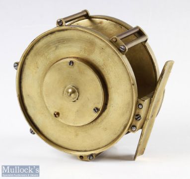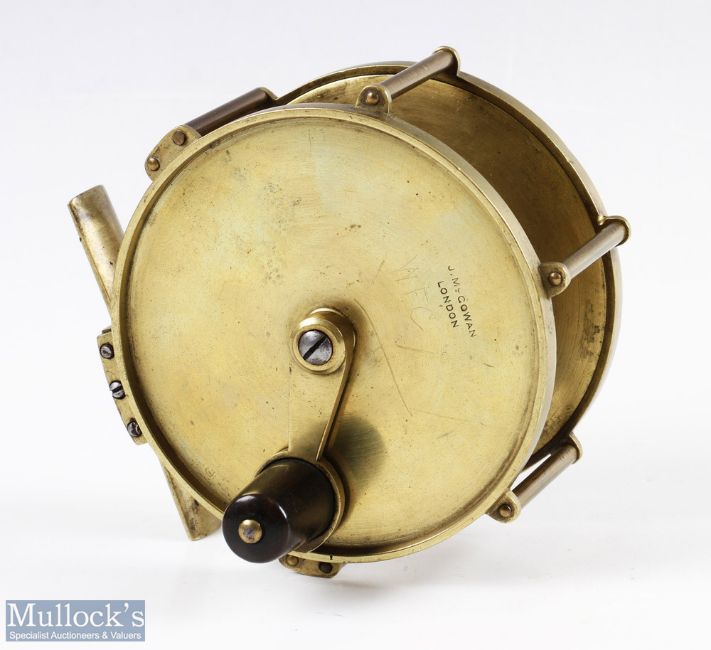 J McGowan, London 4 1/4" brass raised pillar salmon reel anti-foul crank handle with horn knob, twin rolling pillars, one is stuck, runs smooth with check, stamped makers marks to face plate, scratched initials WFC to front and back plates, otherwise good