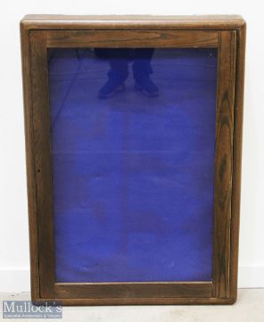 Large Oak Shop Display Cabinets used for displaying shirts, fabric backing but could be used as a counter display, has a brass lock but no keys, with glazed front - size 12cm x 77cm x 106cm. NB heavy item COLLECTION ONLY (d)