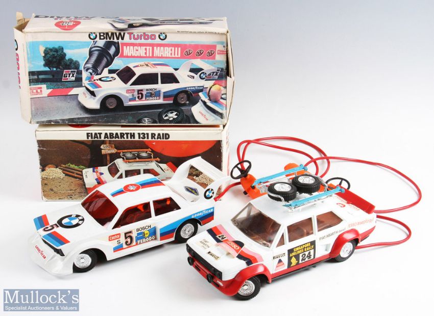 Two Reel large scale Remote Controlled Boxed Cars inc Fiat Abarth 131 Raid with white and ed body with roof rack and accessories, plus BMW Turbo, both boxes in fair condition, cars overall good