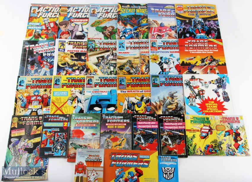 1985-1990 Marvel Comic Transformers Specials Spring Summer Holiday Winter and related publications to include collected special issues 3, 4, 5, 6, 7, 8, 10, 11, transformers poster magazine 1986/87, marvels transformers frees special edition part filled panini sticker book, blackthorn publication No.1 1987, winter special Marvel the movie , Marvel comic magazine No.6 +9, St Michael transformers sticker book, plus a selection of transformers quiz/story books, panini secret wars sticker book part filled, Marvel Action force no.24,24,26,27