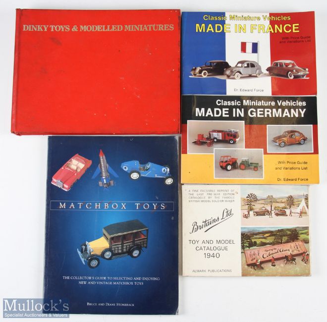 Diecast Model Toy and Cars Collectors' Reference Books to include dinky toys and modelled miniatures 1981, very worn boards -Britains toy and model catalogue 1940 - has loose pages, classic miniature vehicles made in Germany Edward Force 1990+ made in France 1991, Matchbox Toys Bruce and Stoneback 2002 - all in fair condition