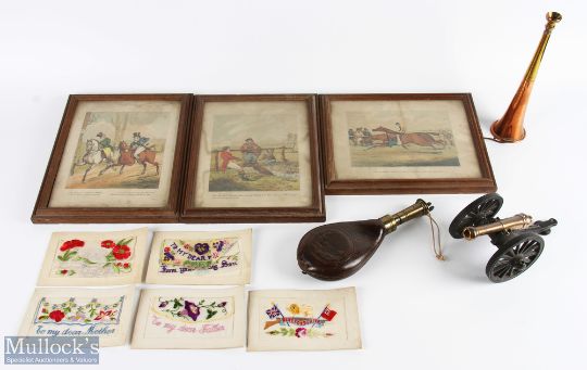 Military and Hunting Collectables, to include a cannon match sticker, 6x WWI Silk Postcards to include a Herefordshire embroidered, Dixon & Son gun powder flask with hunting dogs scene, a hunting horn, 3 small humours hunting/horse riding prints