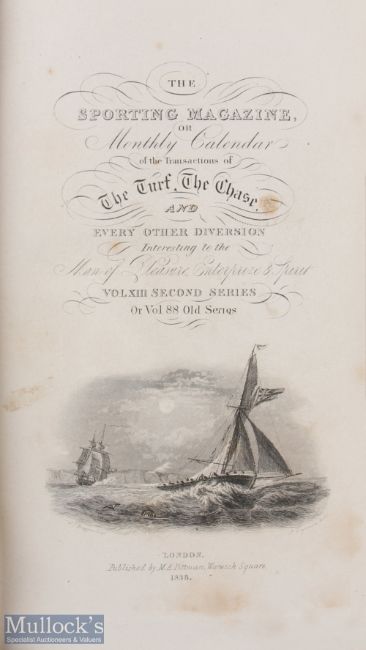 The Sporting Magazine - "Bound Volume" 1836 - 492 pages plus 76 pages of Racing Calendar at back,15 Plates, as well as a lot about Horse Racing, there are Articles about Dogs, Fishing, Game, Horses, Hunting, Cricket etc etc. In original Marble boards with leather spine, size 5 1/2" x 8 1/4"