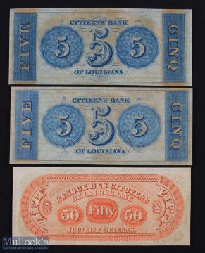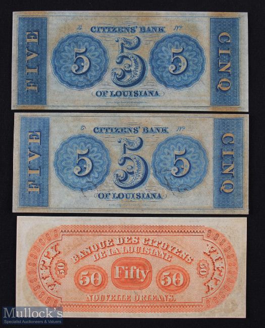 19th century USA Citizen's Bank of Louisiana Unissued Bank Notes (3) - $50 note Shreveport branch note and two $5 notes, all VG unissued crisp condition with light paper discolouring (3)