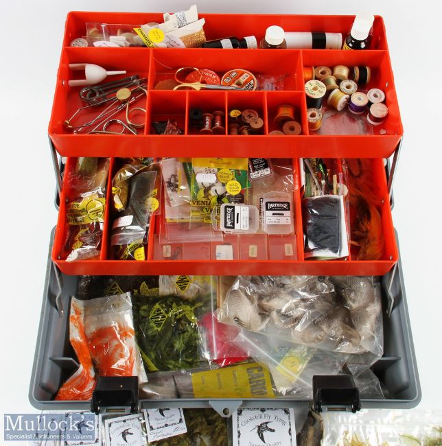 Fly Tying Comprehensive fly tying kit in aplastic cantilever portable chest, furs, feathers, silks, hooks, tools, materials, and accessories in good clean condition