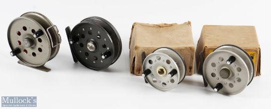 A collection of Strike Right centre pin reels, made up of: 1x A Dura Flo 3 5/8" caged spool, on/off check, in original box, looks unused; 1x Feather Flo 2 7/8" caged spool, on/off check, in original box, looks unused; 1x Ultra Flo 4" caged spool, on/off check, neoprene pouch, light use; 1x Strike Right 4" caged spool, on/off check, line guide, in maker's zip case (4)