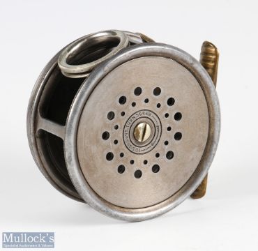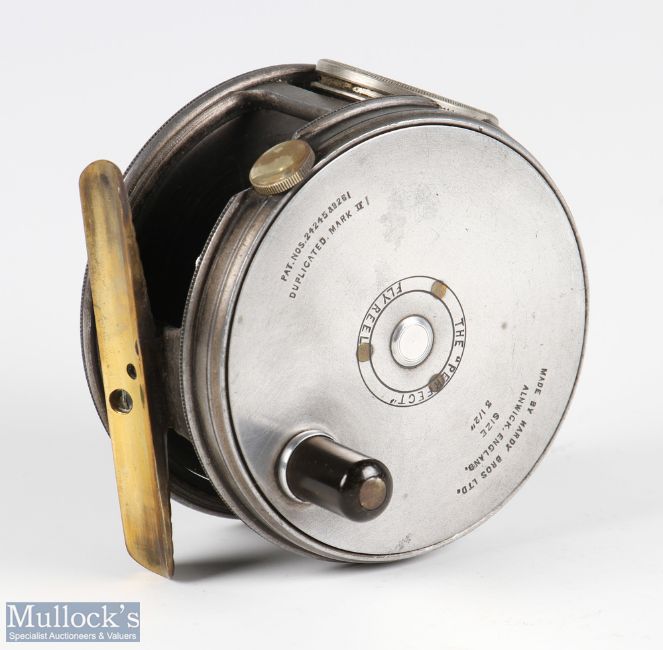 Hardy Bros alloy Perfect salmon fly reel 3 1/2" wide spool, black handle, stamped duplicated Mk II, milled rim tensioner, small and large perforated spool, ribbed brass foot, nickel silver line guide