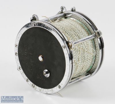 Penn, USA Senator 10/0 Big Game and Deep Water Reel chromed frame with Bakelite end plates, on/off check, star drag, large red stained wooden torpedo handle, decorative big game scene to the end plate, harness lugs for fighting harness, runs smooth with overall minor signs of use