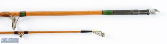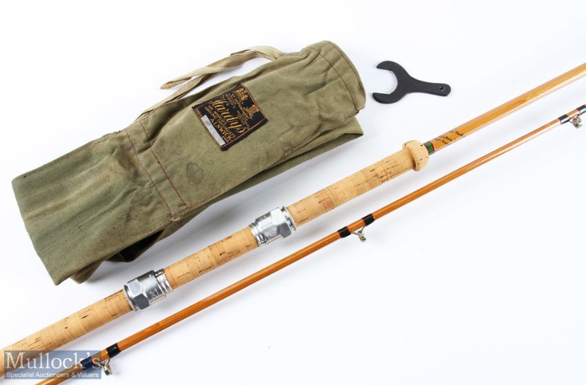 Hardy Bros "The Marksman" split cane palakona spinning rod H17986, 8' 2pc 22" mushroom handle, alloy patent twin sliding reel fittings, monel butt ring with agate lined tip rings, stud lock joint with protector, MCB and spanner, very original