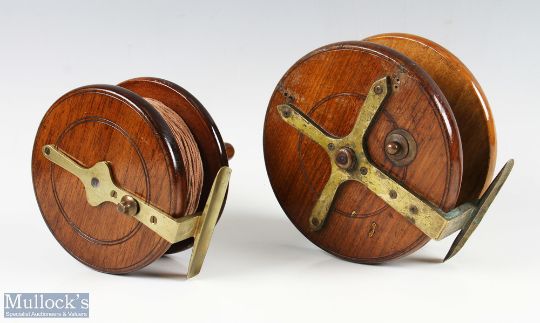 A large star back mahogany and brass reel, 5 7/8" wide spool with twin brass mounted handles, on/off check, works very well; Allcocks Redditch mahogany and brass reel, 4 7/8" spool, twin brass mounted domed handles, on/off check, brass stanchion and foot, runs very well (2)