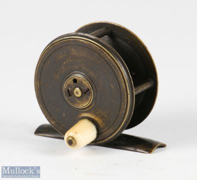 Chas Farlow Maker, 191 The Strand, London, 2.25" brass fly reel, domed horn handle, constant check, retaining a very good colour, looks original, runs smoothly