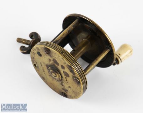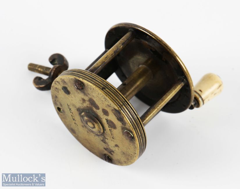 Scarce 19th century J Flint, Dublin 2" brass spike winch reel, bone handle on shaped brass arm, brass wing nut and spike, stamped makers marks to side plate, runs smooth with constant check, one screw head missing from side plate, overall G
