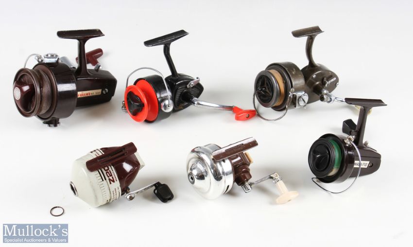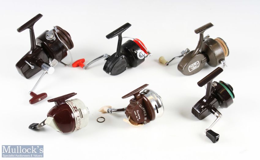 Daiwa No 7600 RHW fixed spool reel, good bail, runs well, zip case; Hercules No 98 LHW fixed spool reel, bail needs attention, zip bag; SMACK-710 RHW fixed spool reel, good bail, cloth bag; Inora 2128 LHW fixed spool reel, good bail, runs well, cloth bag; Compac Clipper II No 36 closed face reel, runs well, cloth bag; Zebco Z20 closed face reel, a bit stiff, cloth bag (6)