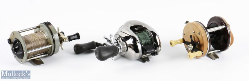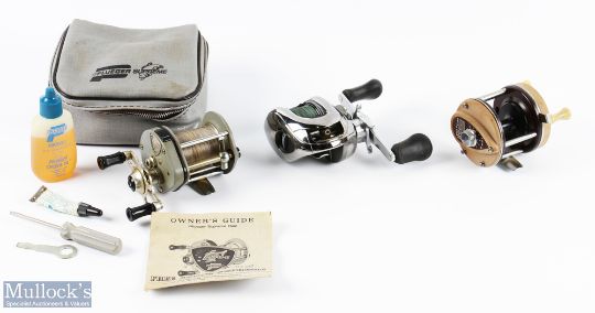 Abu 3000 Multiplier reel No 090902 side tensioner, runs well; Shimano Calais 201 DC LHW baitcasting reel, runs very well, light use in original cover; Pflueger Supreme baitcasting reel side tensioner, runs very well, instructions, tools and parts in original zipped case (3)