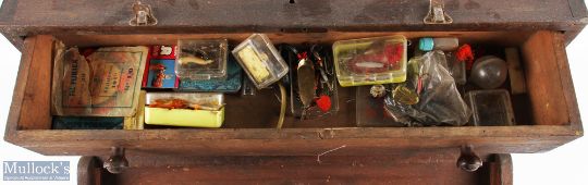 FLY TYING KIT: Portable fly-tying kit in a vintage stained wooden carry chest, with noted contents of baits, lures, minnows, floats, lead weights - names include Gibbs, Doublex