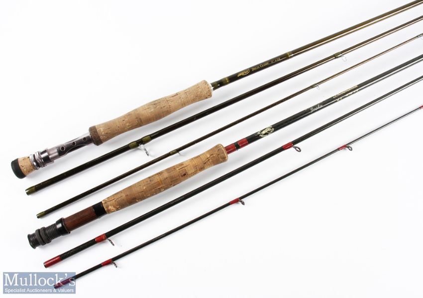 Airflo Delta Classic carbon fly rod 11' 3pc line 7/8#, double alloy uplocking reel seat with burr wood insert, lined stripping rings, Cordura tube; Sue Burgess Diamond Back graphite fly rod 10' 3pc lie 5/8#, double alloy uplocking reel seat, lined rings throughout (2)