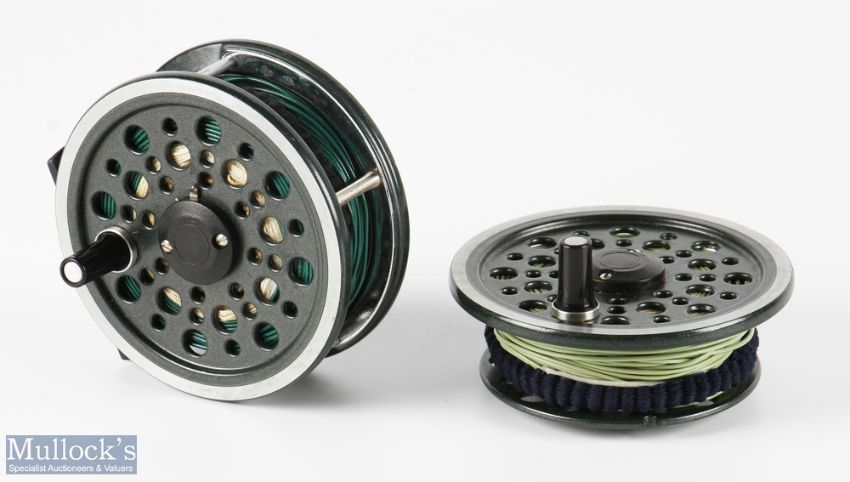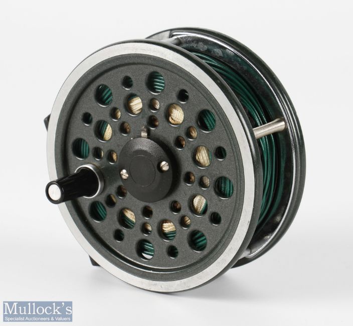 Shakespeare Redditch Beaulite alloy trout reel, 2 screw latch, black handle, 3 1/2" spool, large rear tensioner plus spare spool, cloth bag, runs very well