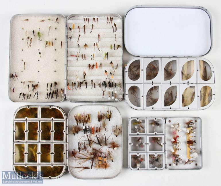 A collection of alloy fly boxes, containing a large selection of trout flies, made up of - 1x Richard Wheatley slim alloy box, 5" x 3 1/2", 12x spring lidded base with dry flies, foam lid with wet flies; 1x Orbex USA alloy box with wet flies, slotted base and foam lid, 6" x 3 1/2"; 1x English Specialist box 6" x 3 1/2", 10x clear spring lidded compartments, daddy longlegs ethafoam lid; 1x English Specialist fly box with 6x clear spring lids and 20x clips in lid, 3 1/2" x 2 1/2" with small river dry flies (4)