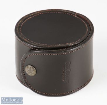 Farlows, Pall Mall, London, block leather, round reel case 3 7/8" dia, dark brown, press stud fastener, stamped with 'State of Oklahoma 1907'