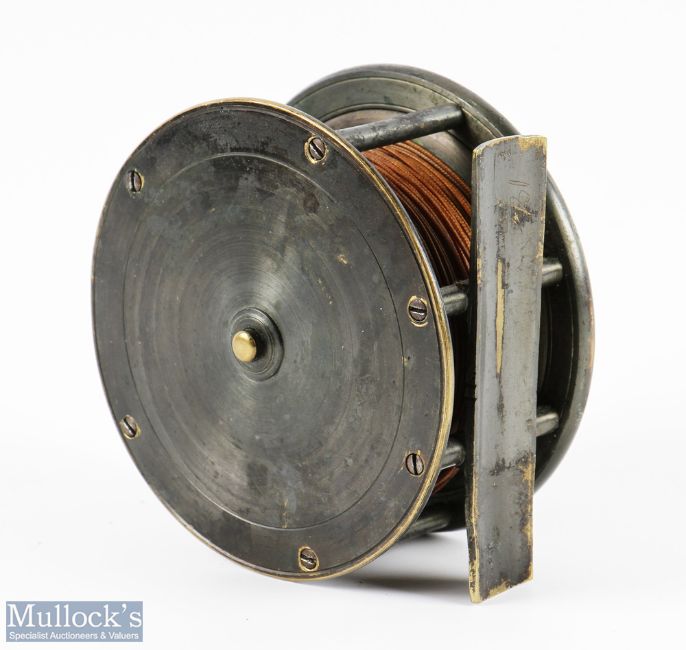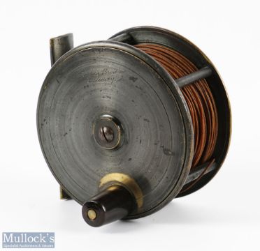 Nicholas Browne, Galway 4" brass centre pin reel, script makers marks to face plate, fat horn handle, runs smooth, good constant check, overall signs of wear and use