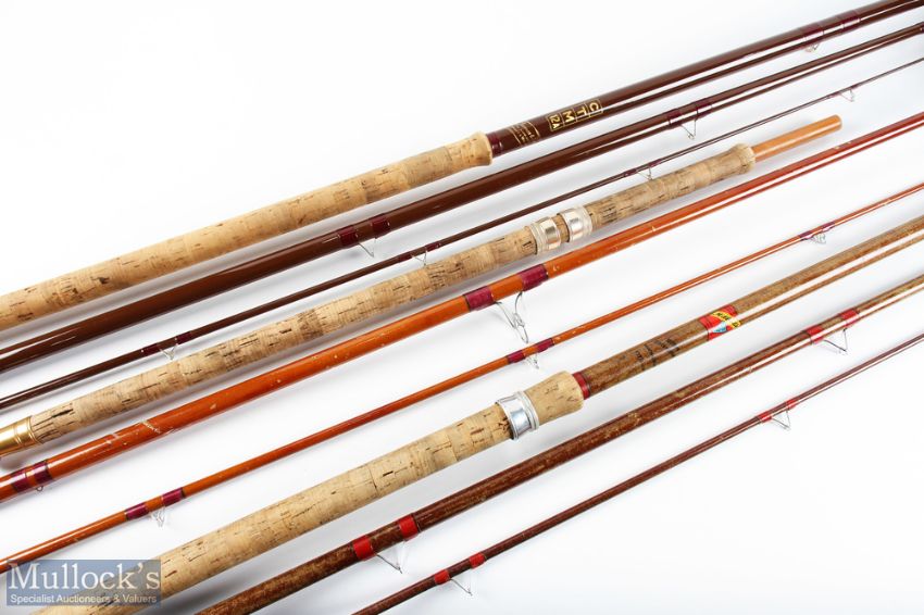 B James & Son in association with Bruce & Walker, hollow glass CTM12A float rod, 12' 3pc 26" handle with alloy sliding reel fittings, agate lined butt/tip ring, joint protectors, MCB, light use; Milbro Milbrolite hollow glass float rod 12' 3pc 22" handle with alloy sliding reel fittings, red agate butt/tip ring, MCB; "The Peter Stone Special Rod" hollow glass course rod 11'6" 3pc 27" handle with alloy sliding reel fittings, cloth bag (3)