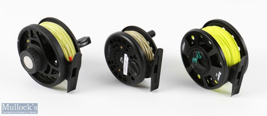 Greys GLA 80 brook fly reel, 3" spool, screw fix counter balanced handle, large rear tensioner with spare spool, light use, runs very well, in Grey's pouch; Greys G alloy brook fly reel 2 5/8" spool, 2 screw latch, counter balanced handle, rear tensioner, light use, runs very well, in Grey's pouch; Airflow Sniper 3/4 brook trout fly line, 3 1/8" wide spool, 2 screw latch, large rear tensioner, light use (3)