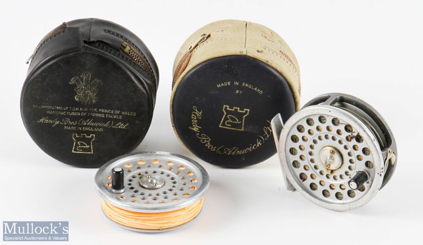Hardy Bros Marquis 6 alloy fly reel and spare spool, both in original zip cases (one with rip to rear), 3 1/4" spool, 2 screw latch, black handle, U shaped line guide, rear tensioner, shows signs of wear but works well. Please note: From the proprietor of the long established and well renowned ‘Sweets’ Fishing Tackle shop in Usk.