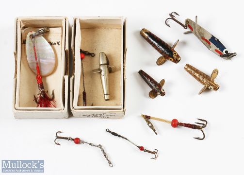 Hardy Lure selection (6) features sizes 0.75" through to 1 1/2" examples with maker's marks, plus Mother of Pearl spoon 1 1/4" - with treble hooks