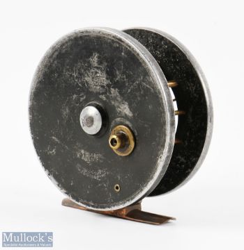 Allcock Aerial Popular 4" wide drum centre pin reel with stag trademark to rear, on/off check, caged drum core, twin handle, spins forever, light surface wear