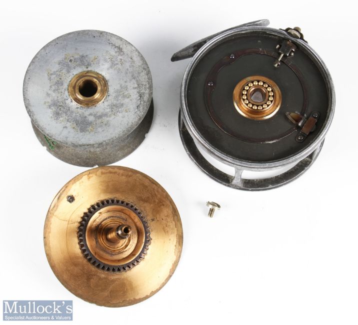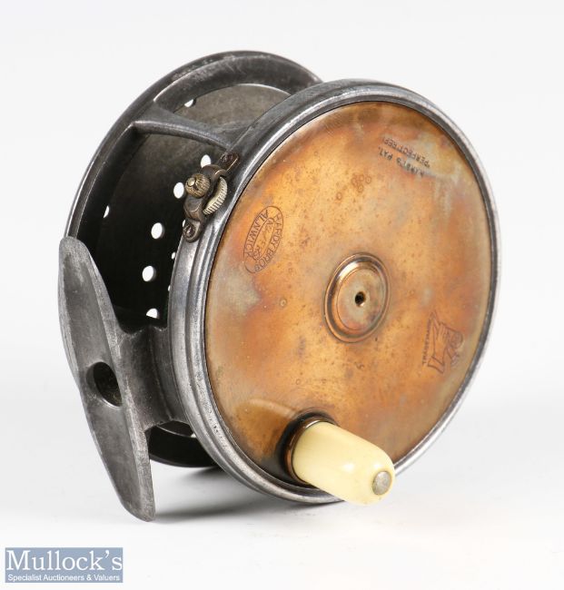 Hardy Bros brass faced Perfect salmon reel, 4" spool, ivorine domed handle, reduced integral alloy foot with central hole, perforated drum, strapped rim tensioner with Turk's head locking screw, hand trademark, open oval and straight line logos