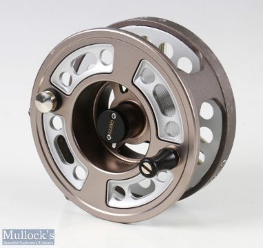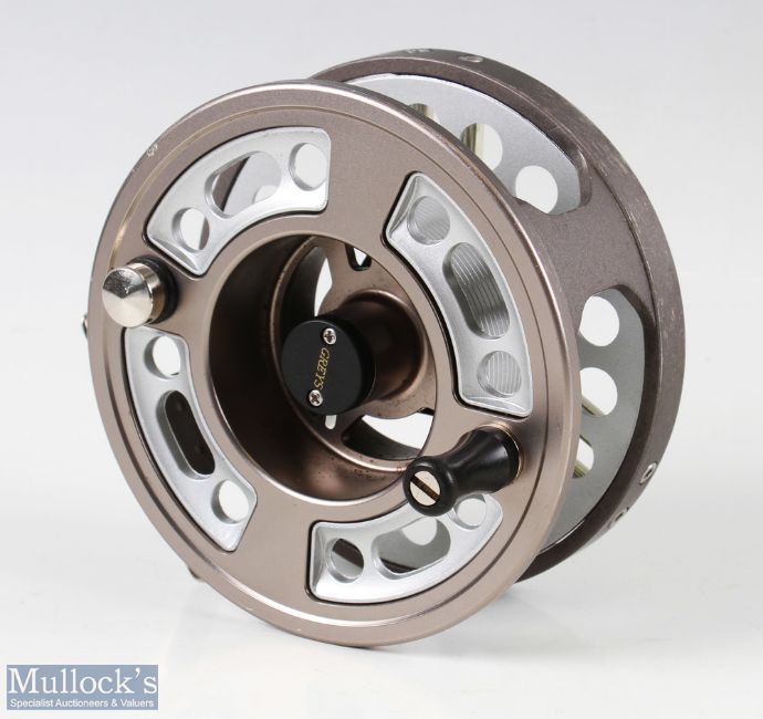 Grey's X-Flite salmon alloy cassette fly reel, 4 1/4" wide spool, 2 screw latch, counter balanced handle, large rear tensioner with 3 spare cassettes, runs well with slight catch