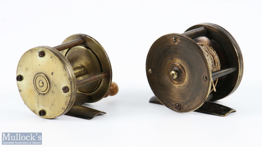 Kelly, Dublin 1 3/4" crank wind brass reel stamped makers marks to end plate, turn handle knob, runs smooth with weak check, together with J McKenna, Dublin 2" brass reel, stamped makers marks to face plate with bone handle, run smooth with check (2)