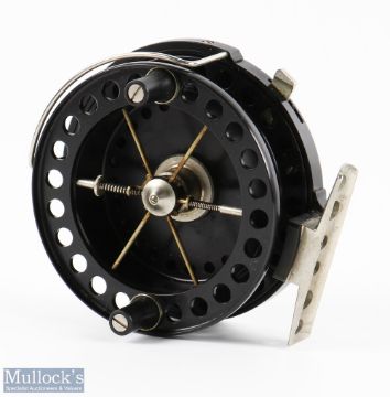 JW Young Purist II Limited Edition 3.5" centre pin reel Model Y2048 serial No. 0190 in black finish Bickerdyke line guide, perforated foot, twin handle, very clean condition, spins well, with pouch and wooden presentation case