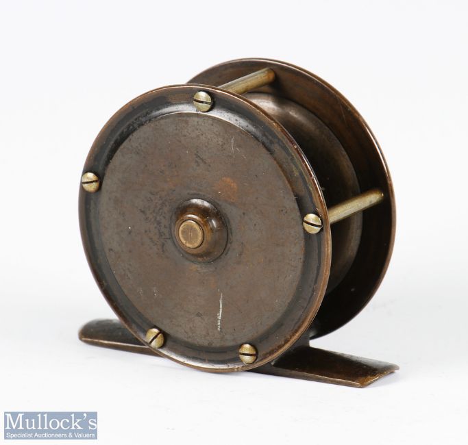 Holroyd Bros Makers, 50 Grace Church Street, London 2 1/4" trout reel, copper bronze Hercules pattern, raised face plate, polished horn handle, constant check, runs very well and looks very original