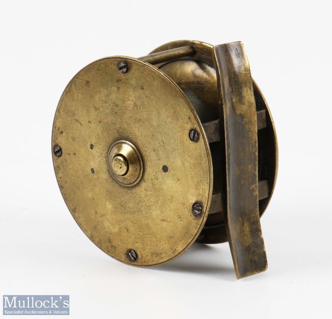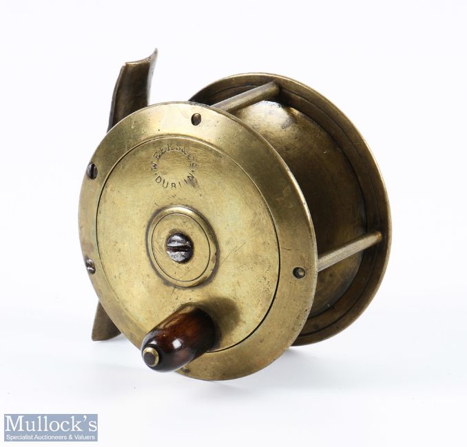 Weeks (Weekes) & Co, Dublin 3" brass fly reel, stamped oval makers marks to face plate, horn handle, runs smooth with check, foot bent with overall signs of use