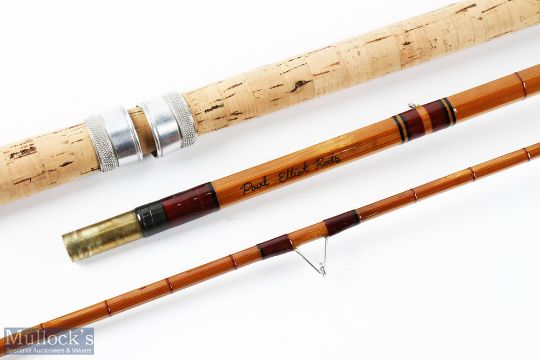 Paul Elliott Rods Co split cane barbel/chub rod 11' 6" 3pc, hollow built with 27" balanced detachable handle with alloy sliding reel fittings and collar, red agate butt/tip ring, cloth bag, very light use