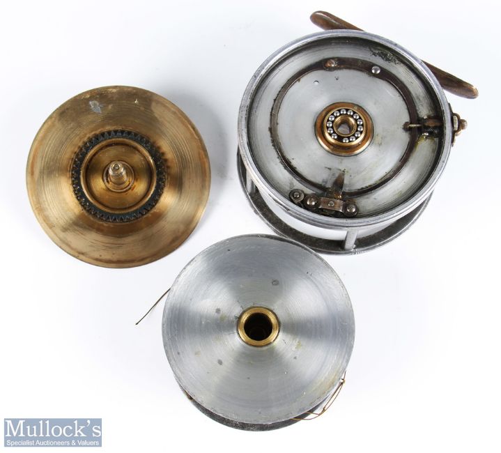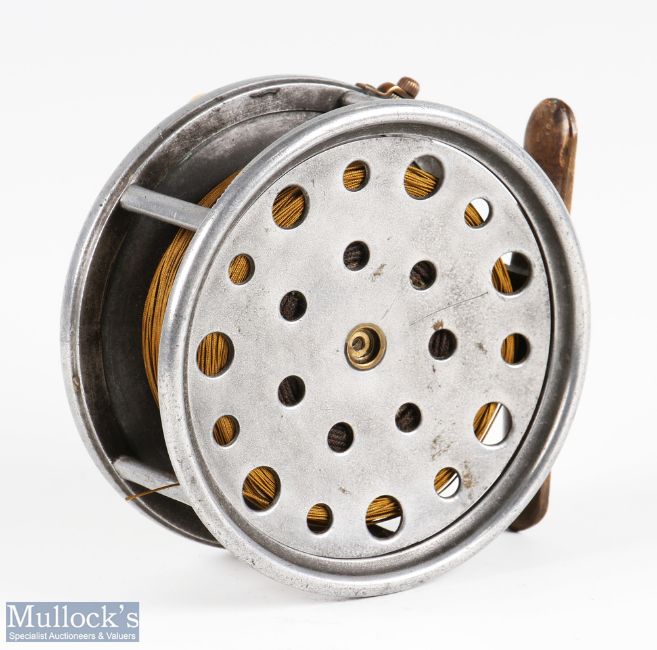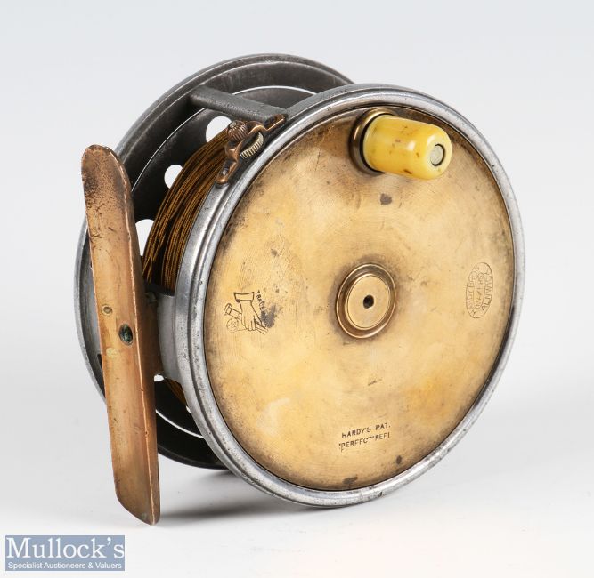 Hardy Bros brass faced Perfect salmon reel 4 3/4" spool, ivorine domed handle, hand trademark, open oval and straight line logo, brass foot with one hole, dished drum with small and large perforations, strapped rim tensioner with Turk's head locking nut (missing screw)