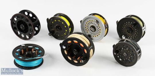 A collection of modern fly reels, comprising: 1x Shakespeare Odyssey 911 salmon reel with spare spool, runs well; 1x BRF Magnum 140D disc drag alloy reel, runs well; 1x Shakespeare Super Convex 3 1/3" trout reel, runs okay; 1x Young's Pridex 3 1/2" trout reel, runs okay; 1x Rimfly Magnum 3 3/4" spool trout reel, runs well; 1x Leeda Profil LA 10/H runs okay, missing handle (6)