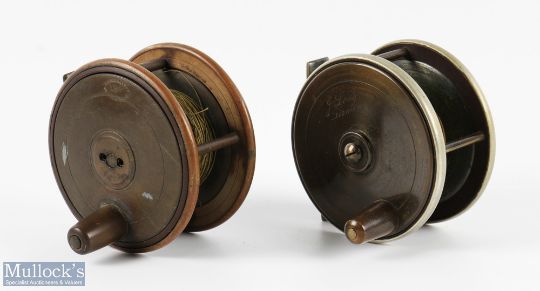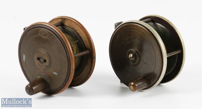 2x Brass and Ebonite plate wind reels - J Long, Fermoy 3 1/2" reel with horn handle and nickel rims, runs smooth with check, together with Carter & Sons, 137 St John Street 3 1/2" reel with brown handle, check not working, bends to foot with overall discolouring and fading to ebonite pieces (2)