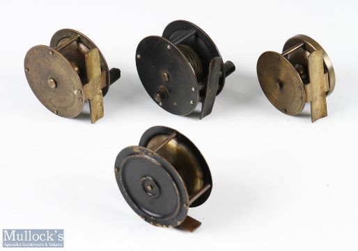 A collection of Allcocks Redditch small reels, comprising: 2 1/4" brass winch with curved arm and black handle, constant check; brass 2" plate wind with domed polished handle, runs smoothly; brass lacquered 2 1/2" winch with straight counter balanced arm, on/off check, runs well; pressed brass 2 3/8" winch, straight arm, domed handle, solid brass foot (4)