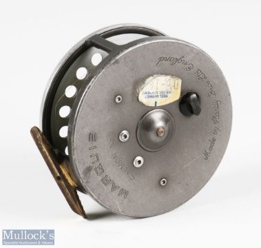 Hardy Bros Marquis salmon No 2 alloy fly reel 4 1/8" spool, 2 screw latch, black handle, rear tensioner, brass ribbed foot, light rim wear, runs very well